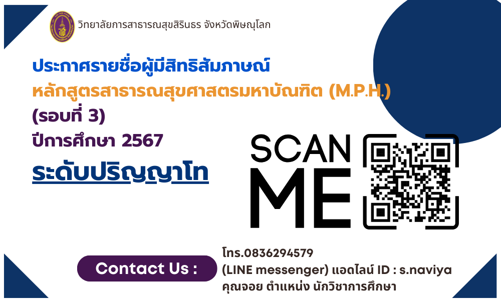 ข่าวการศึกษา ประกาศรายชื่อผู้มีสิทธิสัมภาษณ์ (รอบ 3) ประจำปีการศึกษา 2567 หลักสูตรสาธารณสุขศาสตรมหาบัณฑิต อ่านต่อ » 23 พฤษภาคม 2024